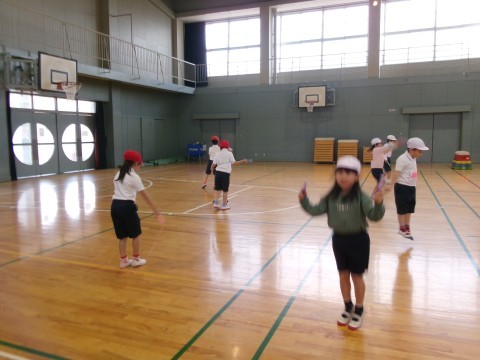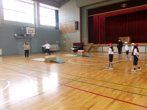 縄跳びと跳び箱の学習です。縄跳びでは,「前跳び20回出来たよ~見てみて!」の嬉しそうな声が聞こえてきました。跳び箱では,着地のポーズを意識していました。