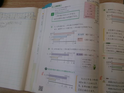もとになる量を1と見たときに,比べる量は何倍といえるかという問題にチャレンジ!何倍というときにもわり算が使えるね~