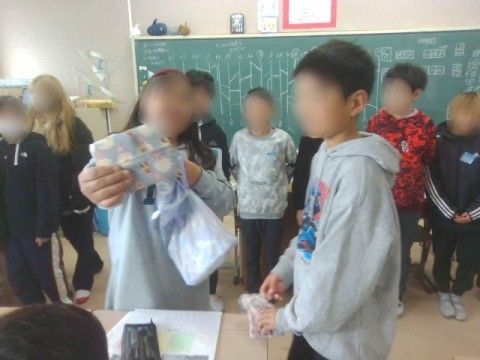 まだまだ慣れないミシンを使い,家庭科の時間に一生懸命作った手作りの『ティッシュケース』をもらいました。担任の先生も含め,全員お揃いです。このティッシュケースは,深阪小学校の6年生しか持っていません。これをお守り代わりにして,中学校でもどんなことにも前向きに挑戦してくれるといいなと願っています。