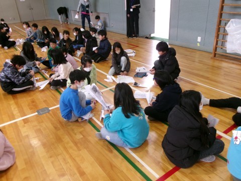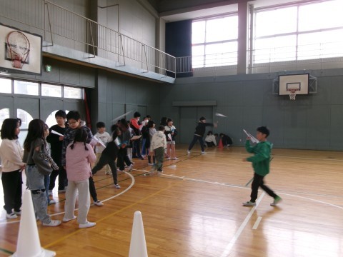 1時間目に体育館をのぞいてみると,3年生と5年生が紙飛行機を折って飛ばしていました。「どうやったら遠くに飛ぶのかな。」「投げ方を変えると遠くに飛ぶよ。」など,グループで話し合いながら活動をしていました。何度も紙飛行機を折っては飛ばして。子どもたちの目がキラキラしていました。