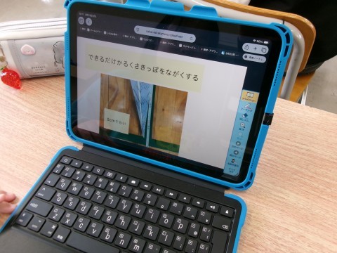 2時間目,3年生は教室に戻って今日の活動のふり返りをしていました。「先がとがっている紙飛行機がよく飛んだよ。」「私は9mも飛んだよ。」など,たくさんの気づきをまとめることができていました。新しいタブレットを使ってのふり返り。さすが3年生!!