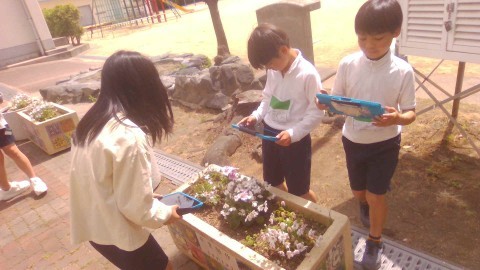 「どんな花も、めしべとおしべが1つの花の中にあるん?」というある子のつぶやきから、学校の中に咲いている花を見つけに行きました。