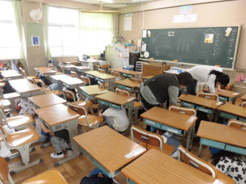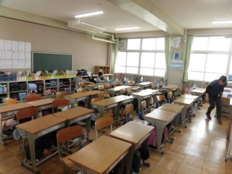 地震の緊急放送が入ってから,机の下に避難をし,運動場に避難をしました。