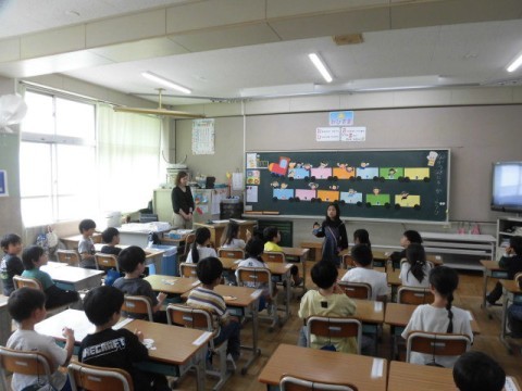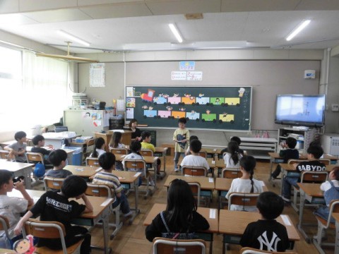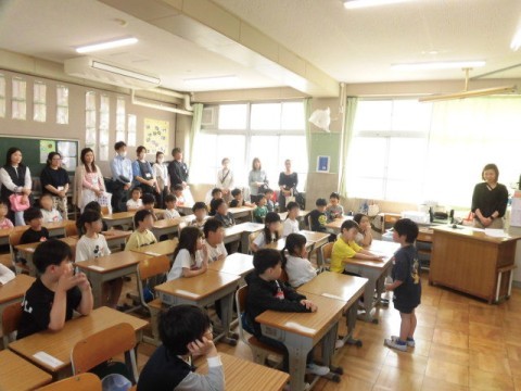 1年生の学習参観では,一人ひとりが黒板の前に立って,自己紹介をしました。