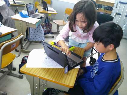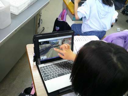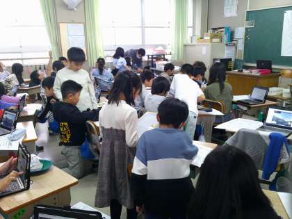 これから校区の学習をするにあたって、深阪小学校から自分の家までをパソコンの機能を使って見ています。わからないときは教え合います。子どもたちはパソコンの使い方にもすぐ慣れて、びっくりです。
