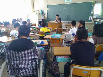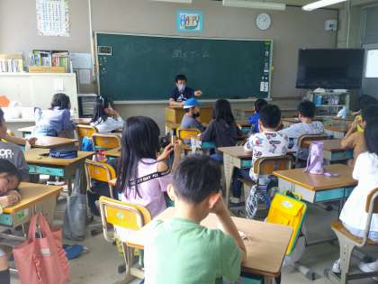 「聞く」ゲームをしていました。同時に複数名の児童がことばを発し、それをよく聞いて何と言ったかをあてるゲームです。静かにならないと始まりませんよ〜