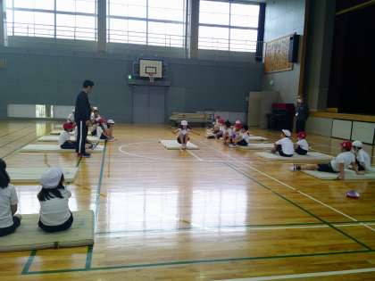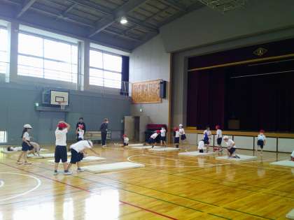 マット運動です。前回りと言っていた運動も前転と呼び、2年生のときよりポイントを押さえて、きれいにかっこよく回ります。注意すべき点を子どもたちから見つけさせています。さあ、やってみよう!