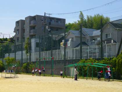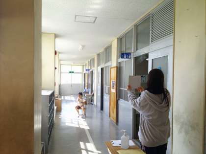 体育は、元気に遊具を使って体をめいいっぱい動かしています。別の時間には、初めての目の検査を廊下で一人ずつしていました。