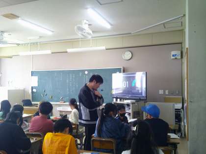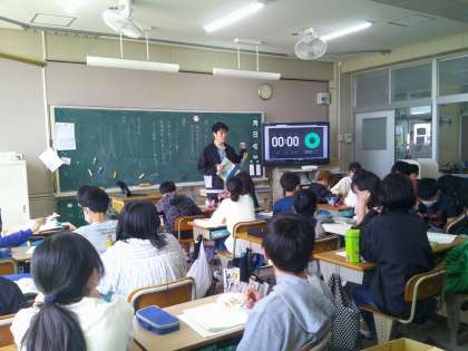 「聞いて考えを深めよう」という教材で、相手の話の内容をとらえて自分の考えをまとめる学習です。今日は、相手を否定せずに話を聞くことが最初の目標です。なかなかユニークな意見が出ていました。