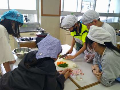 5月30日 6年1組 家庭科 公開日 2023/05/30 更新日 2023/05/30 6年 調理実習です。今日は野菜炒めにチャレンジです。「はじめて、炒め物をした〜。」という声や「油って、はねるんや。」など、様々な体験をしたようです。手慣れた手つきの子に「すごく上手〜。」の声もありました。