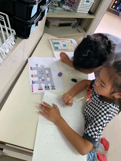 今日は学んだことを活かして、地図上に自分の宝物を隠し、その宝のありかを言葉で友だちに伝えて無事に見つけてもらえるか挑戦することにしました。