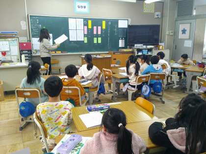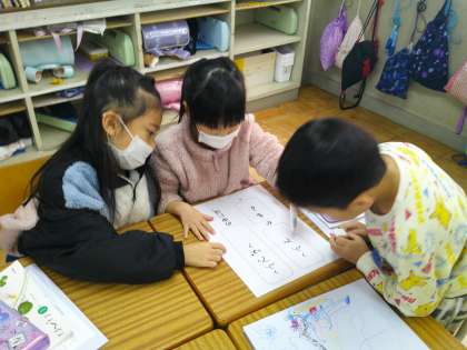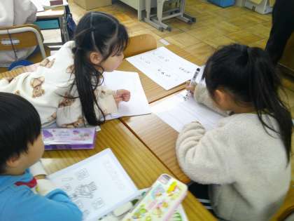 「ことばを見つけよう」という教材で、言葉の中にかくれている言葉を見つけて文にしていました。「うさぎの中にさぎがいる」「あくびの中にくびがある」「えんぴつの中にえんがある」など、様々に見つけることができていました。とても楽しそうに班で考える姿がよかったです。家でもぜひ、探してみてください。