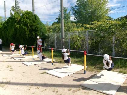 9月10日 2年1組2組 合同体育その1 公開日 2024/09/10 更新日 2024/09/10 2年 鉄棒の運動です。まず初めに「おふとん」です。力を抜くことがポイントです。次に「つばめ」です。腕の力を使って全身を支えます。