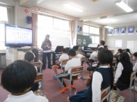 体育館に集まって,スポーツテストにチャレンジ!長座体前屈のやり方の説明を先生にし...