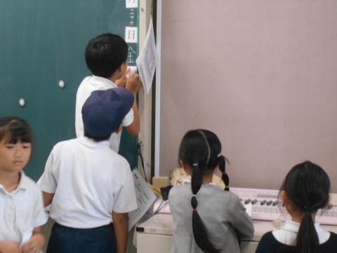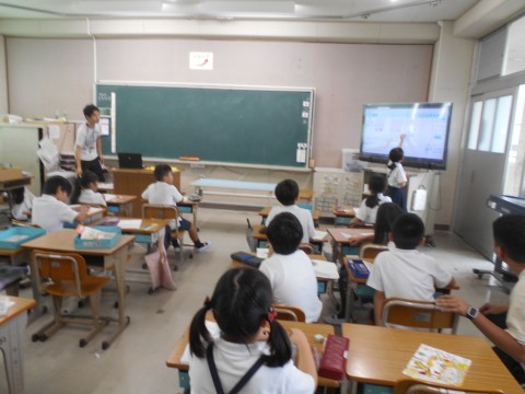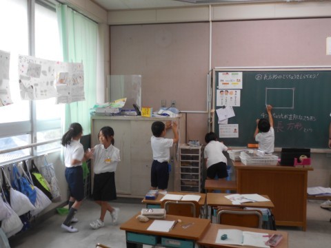 2クラスとも算数の図形で長方形について学習していました。ただの四角から,条件が揃うと4角が直角と向かい合った辺が同じ長さであれば,長方形ということを学び,教室内にあるいろんな長方形や直角を探していました。50個以上みつけた子もいて,いつもの教室から,直角だらけという教室に気が付き,楽しみながら学習を進めていました。