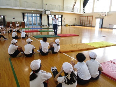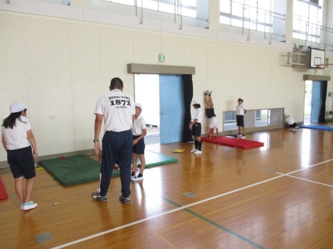 実際に校長先生が壁倒立をしている姿を一生懸命見ながら,