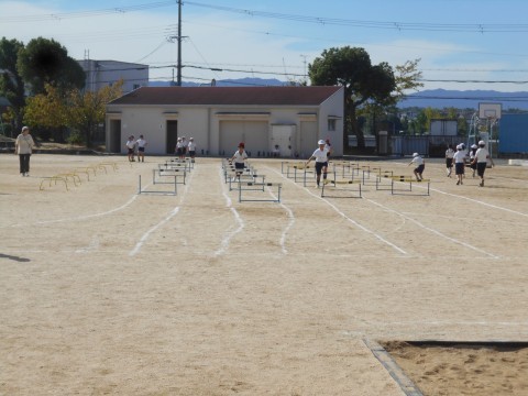 3年生は小型ハードルの授業を行っています。直線の走りに跳び越えるという変化が付くと子どもの感じるリズム感,楽しさはぐんと増していきます。高学年のハードル走に繋がる授業ですが,3年生では,リズムを感じながら走るって楽しいな♪心地よいな♪を,たくさん感じてほしいです♪