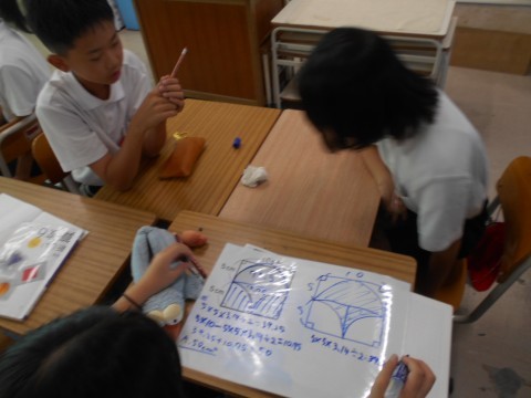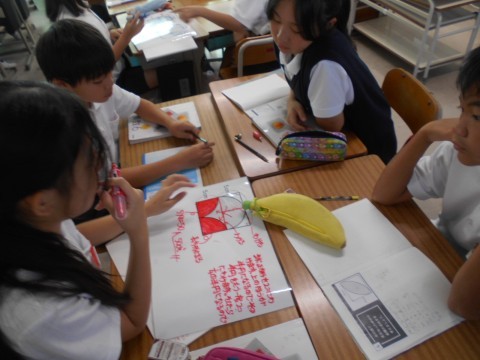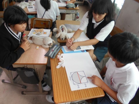 2組は算数で色のついた部分だけの面積を求める学習をしています。必要な部分を動かすと長方形になるかも…など,今までの学習で学んだことをどう活用できるか,みんなで考えていました。