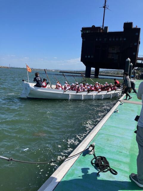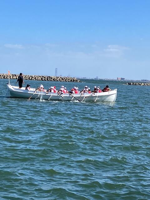 風にも負けずみんなで力を合わせてカッターボートを漕いでいました。