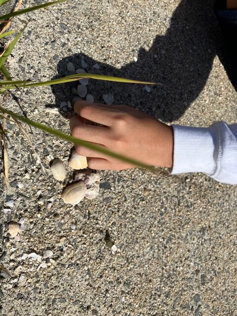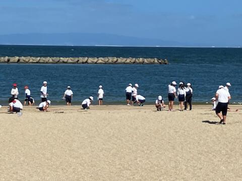 その後砂浜で貝殻集めをしています。シェルメモリーの活動に使う綺麗な貝殻あったかな?