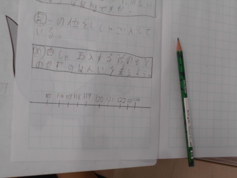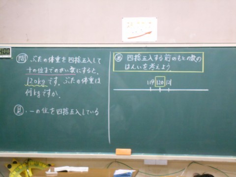 2組は逆に四捨五入した数字から,元の数字の範囲を読み取ることを考えていました。四捨五入のする前,した後の双方の考えを身につけていきます。