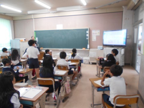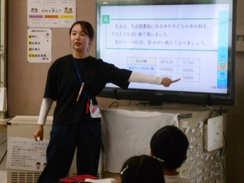 1組は算数でおよその数の学習を進めています。今までは同じくらいで四捨五入をしていましたが,万の数字と千の数字の比較など,もともとの数の大きさが違う時もあります。
