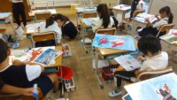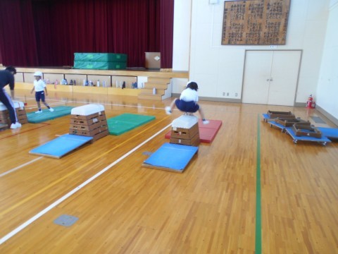 体育の授業で跳び箱をしています。跳び箱の奥に着手して自重を支えることや、お尻をしっかりと高く上げることを意識して跳ぶことができていました。