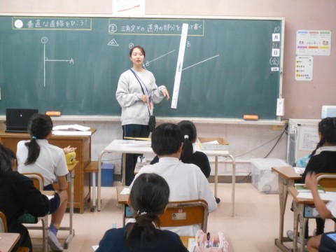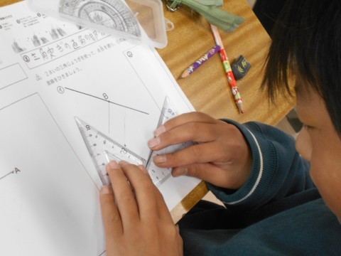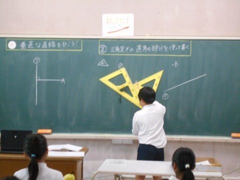 1組は算数で垂直の線をどうやって書くかを考えていました。三角定規を使うことは理解していました。まずイメージをもつこと,点と線がどのような形となるのか,を確認し,自分たちで垂直の線を書いていました。みんなばっちりです♪