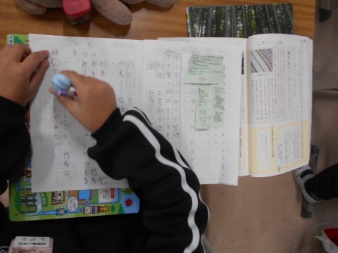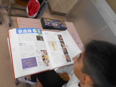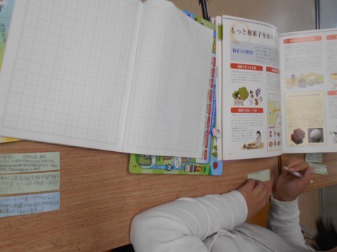 2組は国語で教科書の説明文にならって,自分が興味ある伝統工芸品を調べ,その良さを分かりやすく伝えるための,大切な内容をふせんに夏季だし,それを組み合わせながら文章を書いて校正していました。