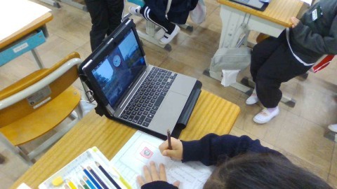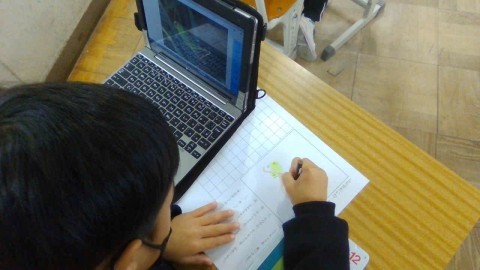 国語科「しらせたいな、見せたいな」の学習で、タブレットで撮影した写真などを基に知らせたい物や生き物の絵を丁寧に描いていました。色や形、大きさや触感などの特徴をしっかりと捉えることができていました。