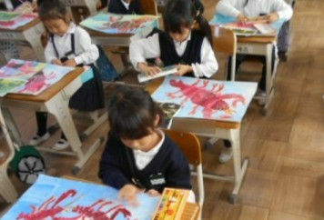 2組は図工でざりがにの絵を描いていますが,今日は背景を描いていきます。自分が好きな水の中の景色を選んで描きます。