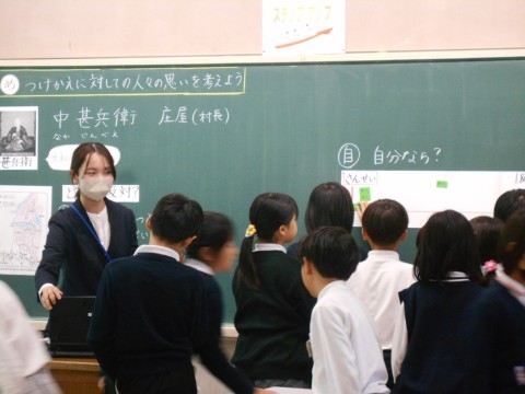 1組では,社会科「きょう土をひらく」の学習をしています。洪水の多かった大和川周辺の人々のくらしを知り,もし自分だったら大和川の付け替えに賛成するのか反対するのかを考えています。それぞれ自分の考えをもって授業に参加している姿が素敵でした♪