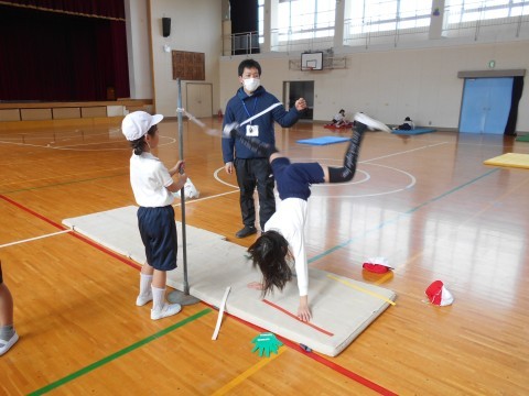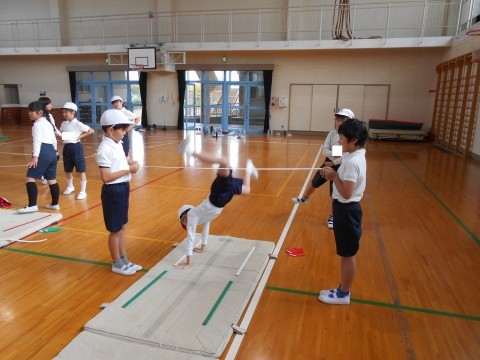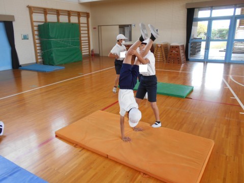 2組では補助倒立や側転の練習をしていました。目線や足の上げ方などたくさんのポイントを意識して頑張っていました。補助も上手にできていました☆