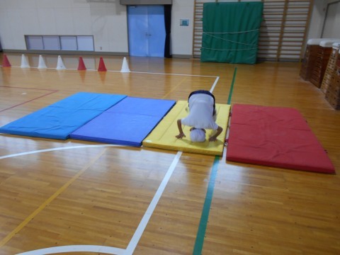 2組では,サーキットをしていました。ケンケンや前転,ジャンプなどの運動を楽しそうにしていました。