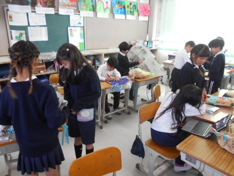 1組では,図工「くしゃくしゃギュ」の学習をしています。紙袋にいろいろな物を詰めて,膨らませて何ができるかな?袋を動物に見立てて目や口を描いたり,お花に見立てて花びらを描いたりしています。想像力を働かせて,楽しそうに活動しています♪