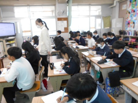 1組では算数「反比例」の学習をしています。表をいろいろな視点から見て,数の関係性をみつけていきます。