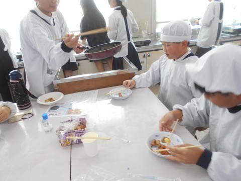 野菜を切って,じゃがいもを茹でて,炒めて味付けをしたら完成です。教室や廊下においしそうな香りが,ふわぁっと広がっていました♪