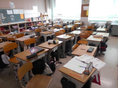 子どもたちには開始日時を伝えていないなか,運動場で遊んでいた子どもたちは素早く中央あたりに集まり,校舎内児童は机の下に身を隠していました。先生たちも人数確認,逃げ遅れの児童捜索などの動きも確認しました。