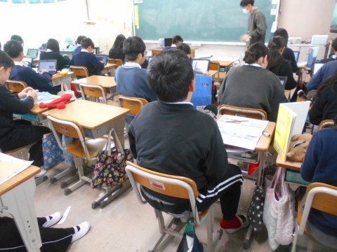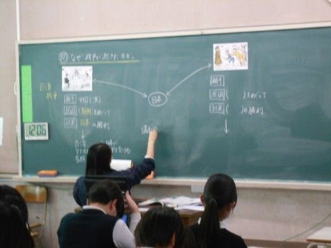 1組は社会で日清戦争・日露戦争を学習していました。それぞれ戦争が起きるまでの様々な背景がありました。事後の対応も含めて,自分たちで調べて,全体で共有をしています。