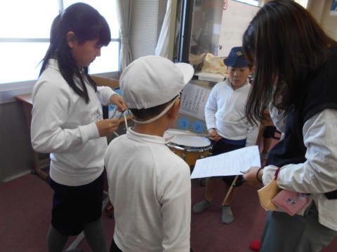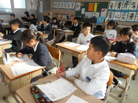 1組では,音楽の学習でいろいろな楽器を使って音を鳴らしています。楽器は正しい使い方をするとキレイな音を聞かせてくれます。今日は良い音と悪い音の違いをグループで聞きあっていました。2組では,算数の学習で分数についての復習プリントに取り組んでいました。3年生からスタートした分数。みんなスラスラ問題を解いていました。