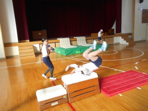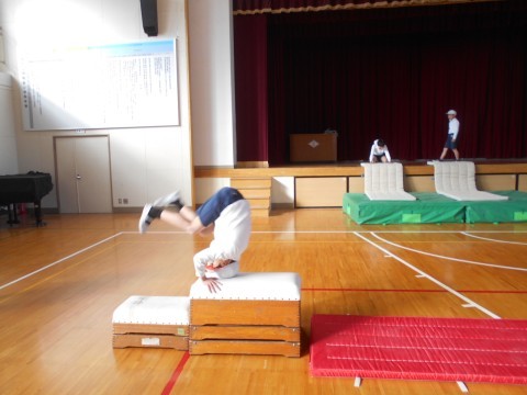 4年生の体育は台上前転を練習しています。簡単にいうと跳び箱を上を前転するだけですが,実際にやってみると怖いものです。