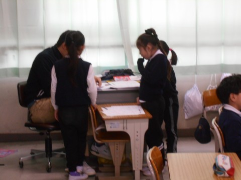 1組は算数で4ケタの数字の並びが1メモリの大きさと合っているか,復習プリントを頑張っていました。
