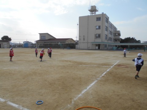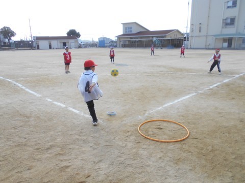 1組は体育でキックベースを楽しんでいます!思いっきり蹴ったら少しでも多く点が取れるように全力ダッシュ!守備もアウトにできるポイントにダッシュです!