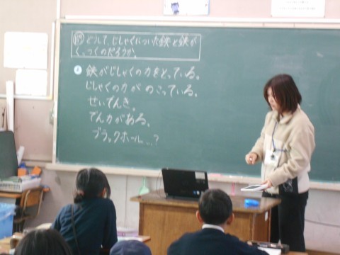 3年生は理科で磁石の学習をしています。磁石に引っ付いたクリップの先に,なぜさらにクリップがつくのか。