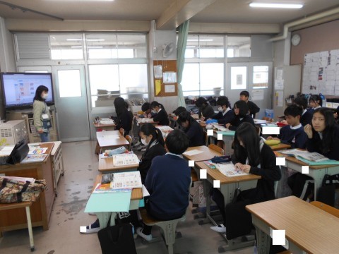 2組では,外国語の授業で,小学校の思い出についての話し方を学習していました。リスニングの問題では,音声をよく聞いて考えていました。
