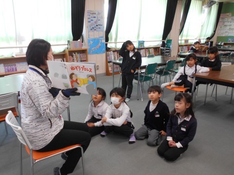 2組では,図書の時間です。図書司書の先生に読み聞かせをしてもらっています。お話が終わるとニコニコ笑っていて,楽しいお話だったのかな?