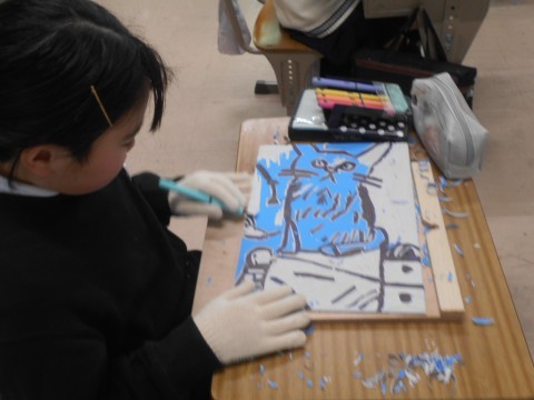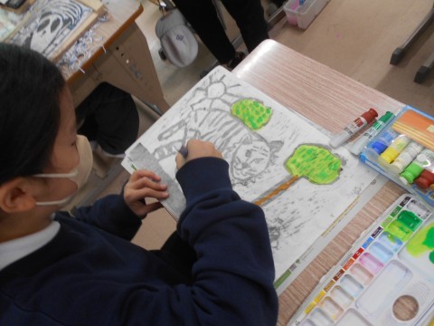 1組は図工で彫刻刀での版画の作成を進めています。すり終わった人は裏から絵の具で色を付けて,カラー版画として完成をめざします。