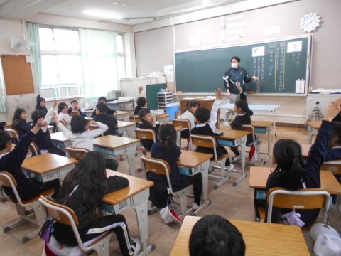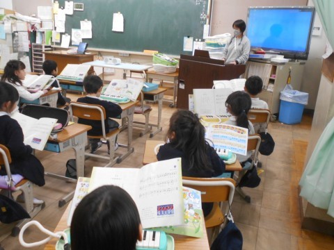 2組は音楽で鍵盤ハーモニカを使用していました。まずはいつもの歌で君が代と校歌を強弱をつけて歌っていました♪