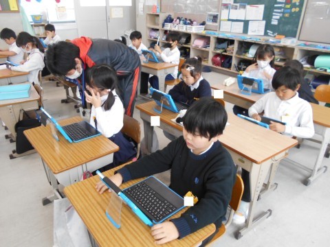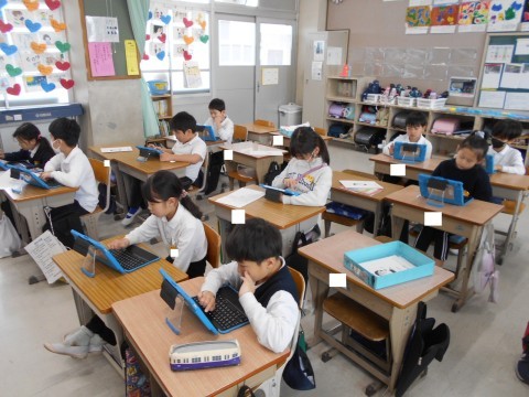 1組では,音楽の学習をしていました。いつも大きな声で楽しそうに歌っています。鍵盤ハーモニカのテストに向けて「こぐまの二月」と「メヌエット」の練習を頑張っていました。