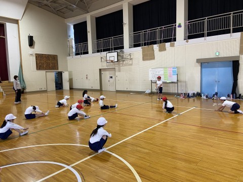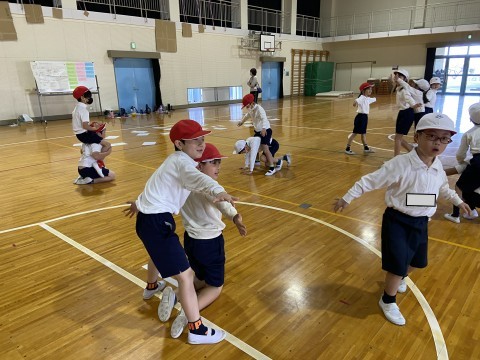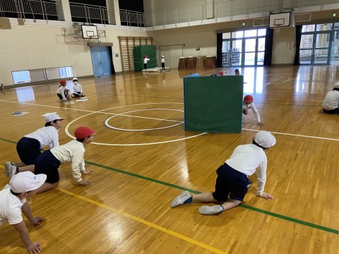 3/5 2年生「体育」 公開日 2026/03/05 更新日 2026/03/05 2年生 体育科「生きものランド」の様子です。全身を大きく使い,いろんな生き物になりきっています。準備運動では,新聞紙やボールになり切ったり,かるたに描かれている動物に合わせて即興的になりきったりしました。主な活動では,ある生き物になりきり,簡単な物語を作っていました。協力して話し合いながら,活動を楽しんでいました。